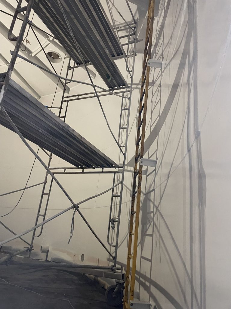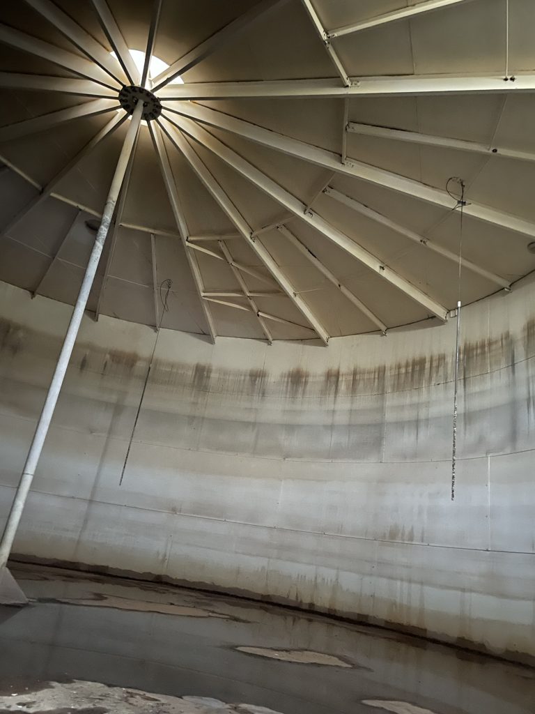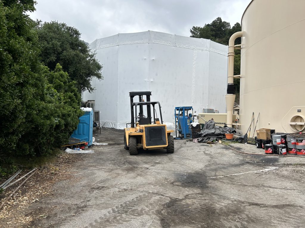 The Contractor, J. Colon Inc., began construction in January 2023 when the 420,000-gallon storage tank was taken out of service while welding and other internal and external steel components of the structure were repaired. As of today, some structural repairs have been completed. A new project phase, consisting of the interior roof and exterior shell sandblasting, will begin next week, and the entire tank will be wrapped in a thick white plastic enclosure. Workers will construct the containment system around the water tank to conceal and contain the sandblasting and painting.