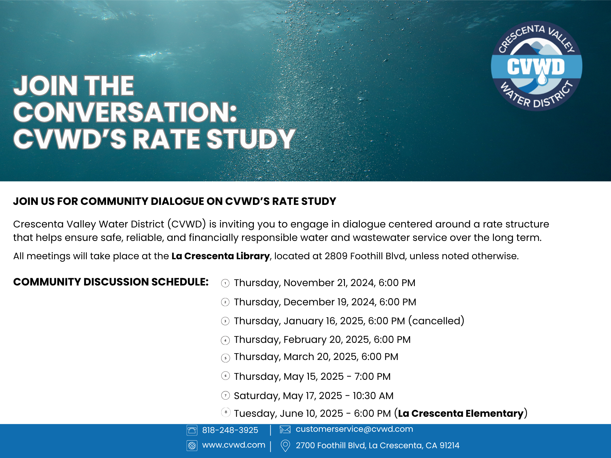 The Crescenta Valley Water District (CVWD) Board of Directors will conduct a public hearing to consider proposed rate adjustments for water and wastewater services. If approved, the new rate structure will take effect for service provided on and after July 1, 2025.